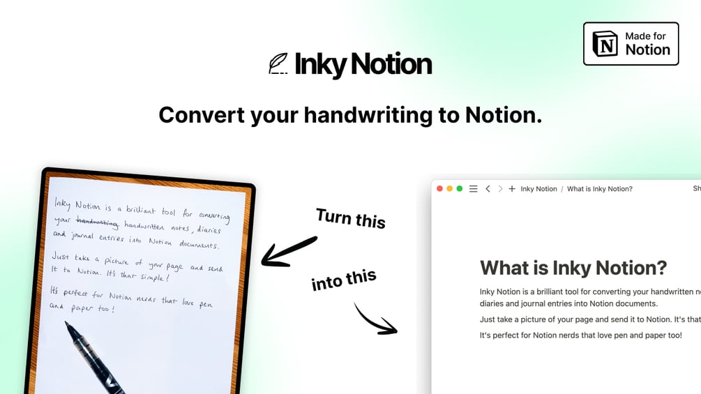 With Inky, convert and organise your handwritten notes easily. Inky is your easy to use Notion template that let’s you take a photo of your notes directly from Notion. From there, we use cutting-edge AI to transcribe your notes and place them straight into Notion. Just a couple taps.